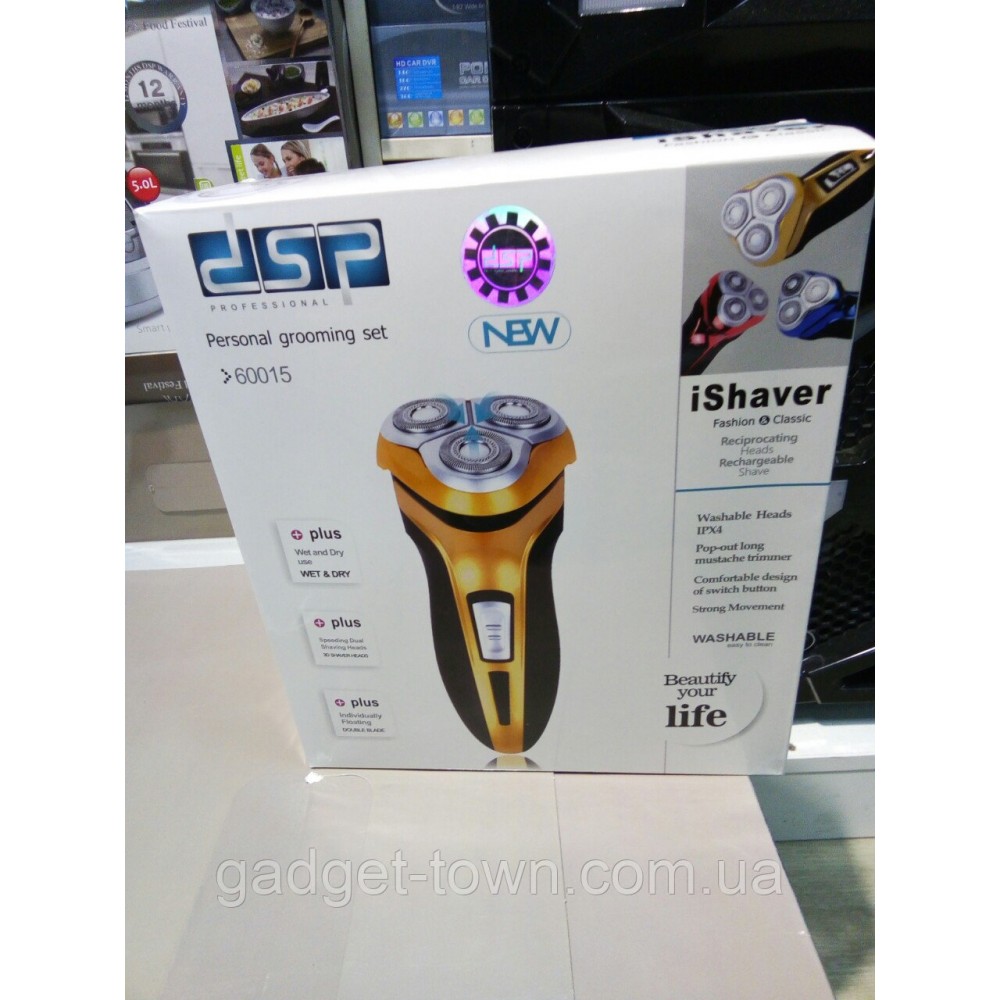 Электробритва DSP 60015 - создана специально для мужчин, которые хотят всегда хорошо выглядеть как дома, имеется встроенный триммер. 3 плавающих бреющих головки которые максимально плотно соприкасаются с кожей лица, осуществляется комфортное и лёгкое бритьё.