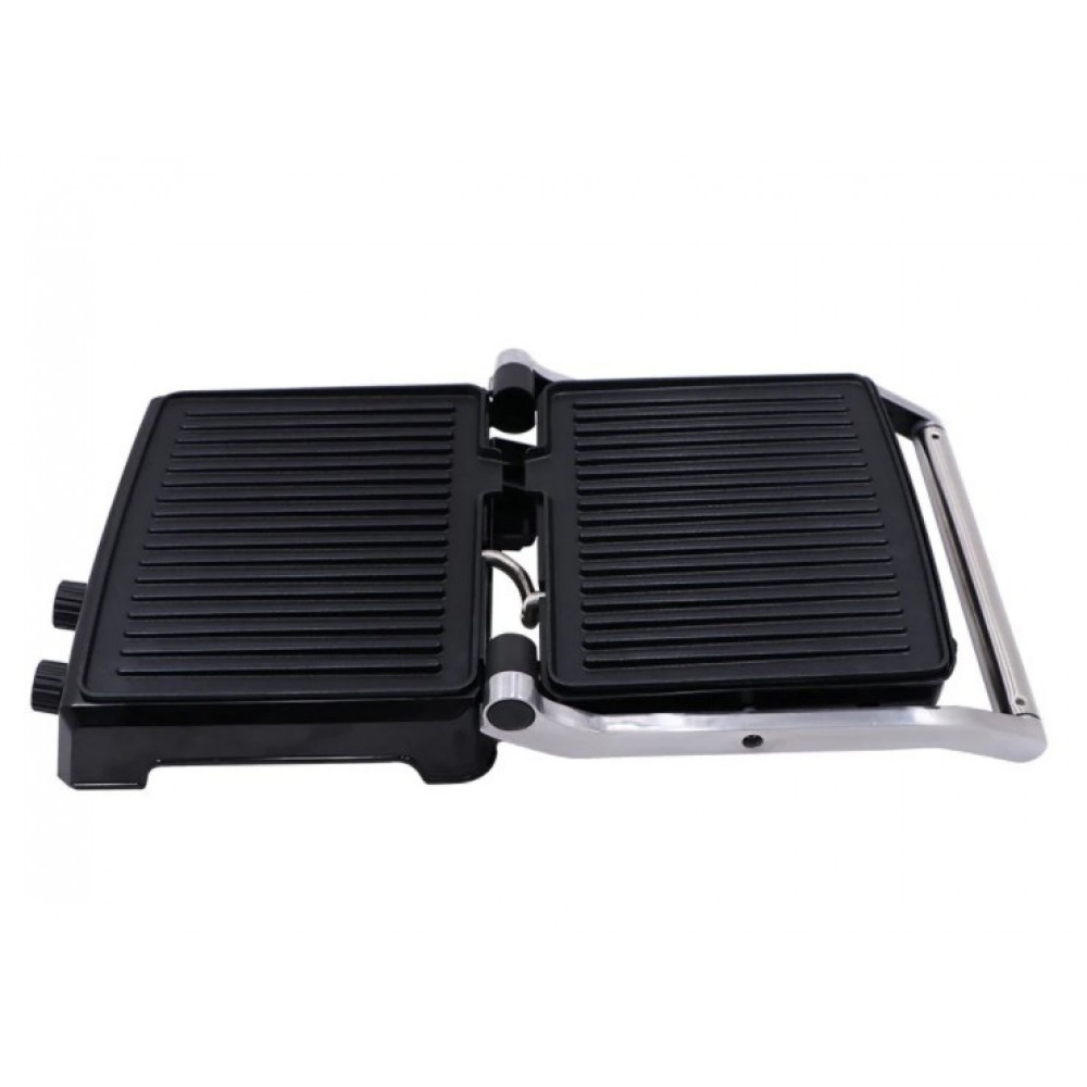 Антипригарное покрытие пластин поможет вам легко и быстро протереть ее после использования. Створки гриля раскрываются на 180 градусов, что позволяет использовать их как поверхности для жарки одновременно. Есть специальный поддон, куда будет стекать весь сок от продуктов. Плавная регулировка температуры позволит вам подобрать оптимальный режим для любого продукта, а таймер поможет Вам не испортить Ваши кулинарные шедевры если вы отвлечетесь.