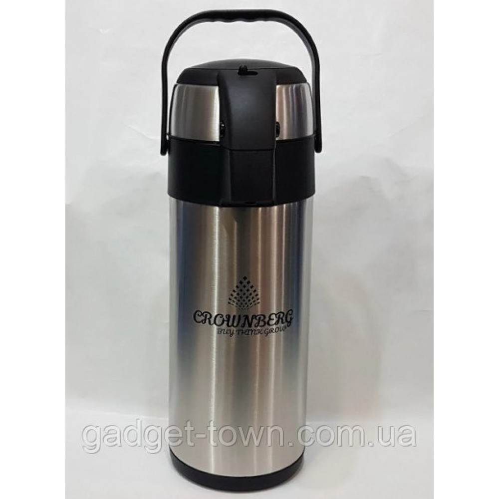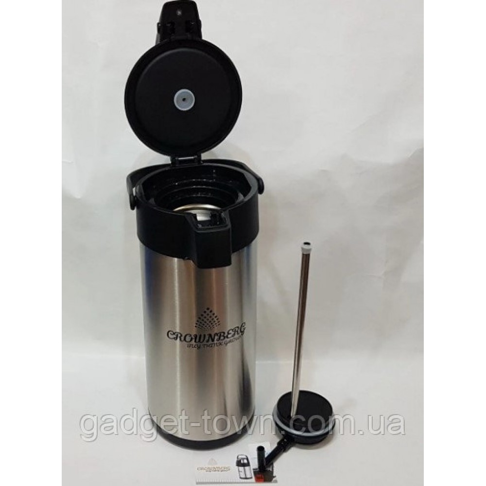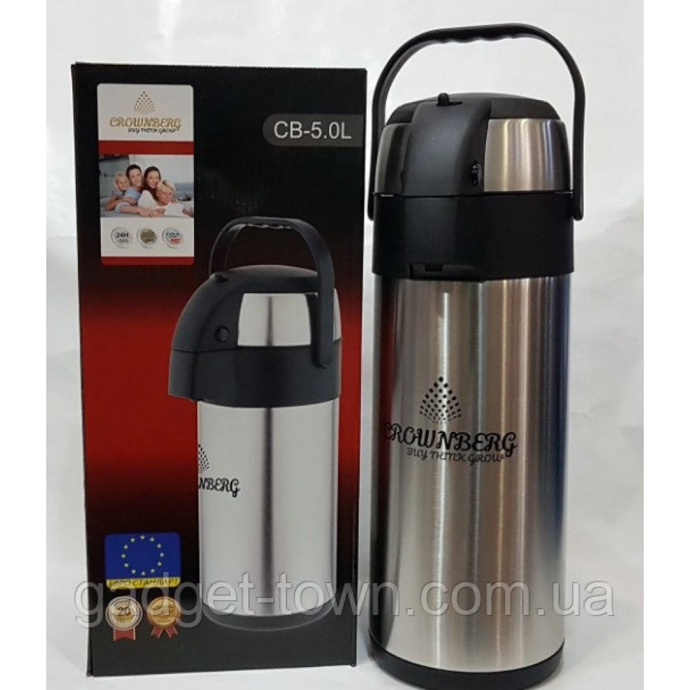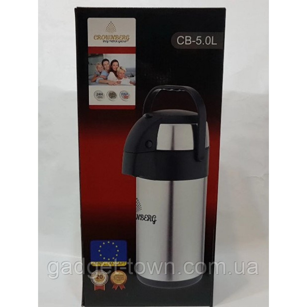 Термос с помпой Crownberg CB 5L это термос из нержавеющей стали с помпой. Колба термоса изготовлена из стали, обладает высокой прочностью к перепадам температуры. Крышка из пластика оснащена пневмо насосом, хорошо и плотно прилегает к горловине термоса, прекрасно сохраняя температуру внутри термоса, также имеется кнопка для блокировки пневмо насоса. На крышке имеется подвижная ручка, благодаря которой легко и удобно транспортировать термос.
