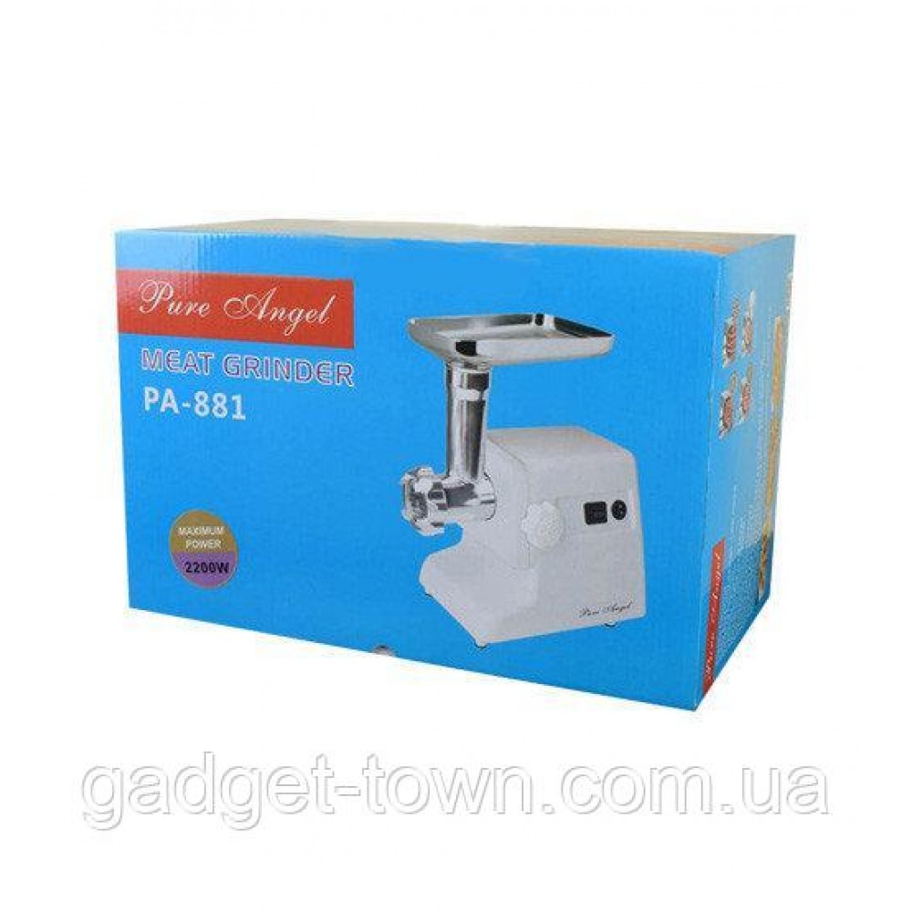 Если Вы любите вкусно поесть дома, то электрическая мясорубка Pure Angel PA-881– идеальный помощник для каждой хозяйки. Мясорубка PA-881 подходит для приготовления кулинарных изделий из мяса и рыбы. Разнообразить стол вкусным блюдами, такими как колеты, зразы, мясные запеканки, колбасы Вам помогут специальные насадки для фарша и насадки для колбас. Мясорубка Pure Angel компактная и красивая, надёжна в работе. тКорпус мясорубки изготовлен из качественного пищевого пластика, его легко мыть.