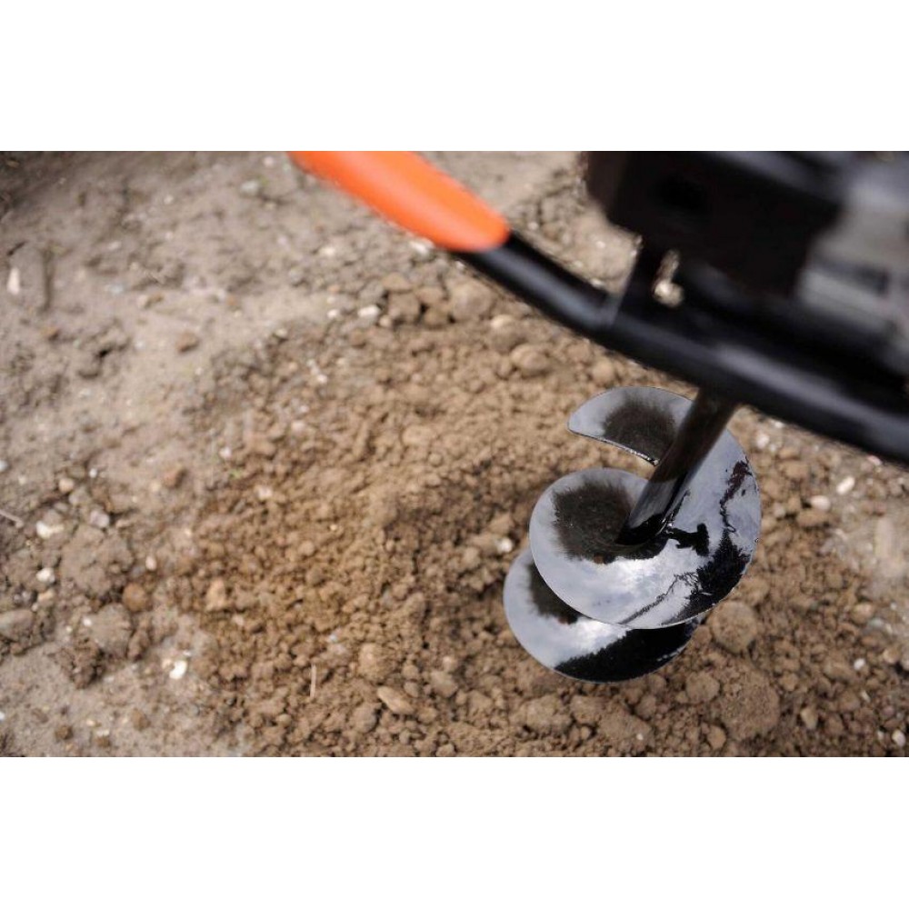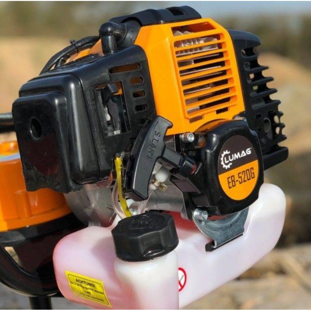 фірмовий мотор двотактного типу економно витрачає бензиново-масляну суміш і забезпечує ефективне буріння всіх видів грунтів, включаючи кам'янистий ґрунт; несильним ривком тросу обладнання включається в робочий режим; повітряне охолодження двигуна під впливом природного обдування потоками вітру; комплект з трьох зносостійких ножів зі спіральним лезом дозволить висвердлити поглиблення різних діаметрів; форма шнека забезпечує видалення землі при виконанні грунтових робіт; зручні рукоятки дають впевнений хват інструменту і утримання при оперуванні; портативність компактної машини незамінна при частому транспортуванню між об'єктами.3 причини купити Lumag EB 520G: