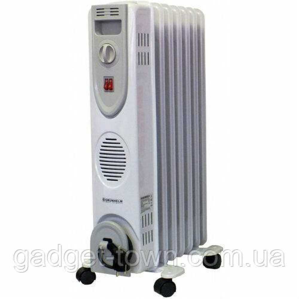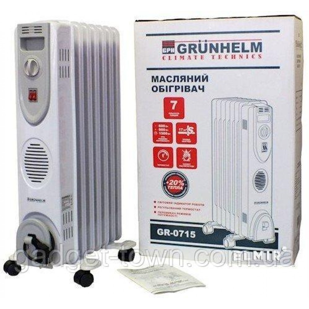 Масляный обогреватель «Grunhelm» ― имеет герметичный биметаллический корпус наполненный минеральным маслом, которое нагревается с помощью электрической спирали.
