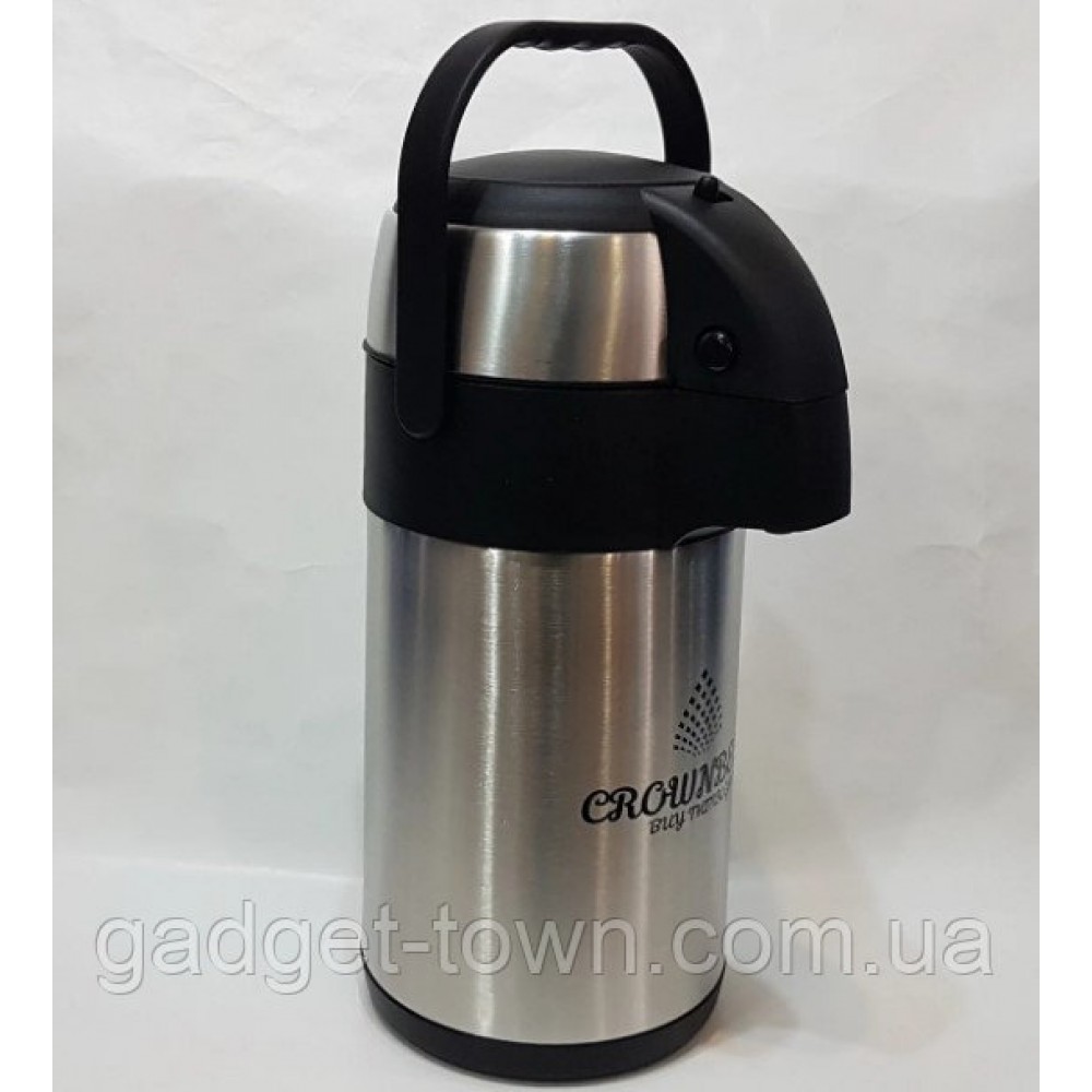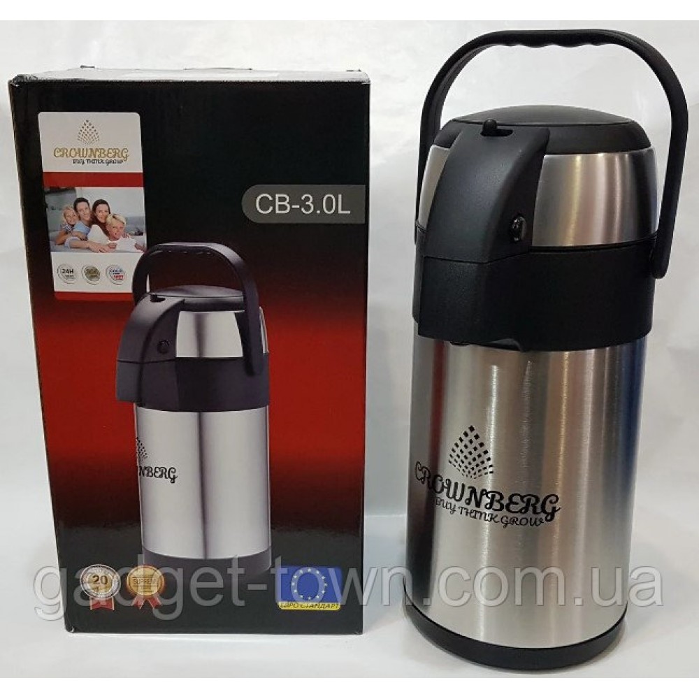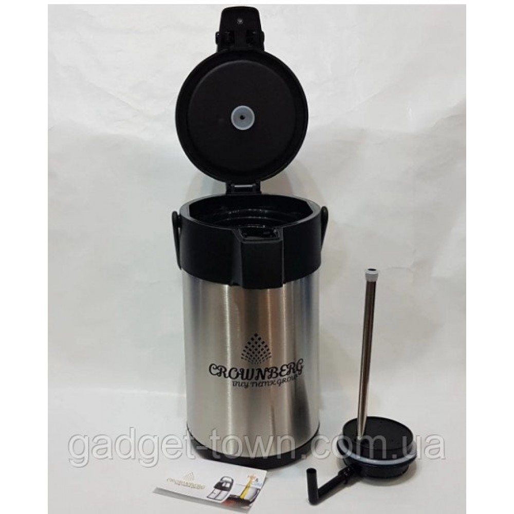 Термос с помпой Crownberg CB 3L это термос из нержавеющей стали с помпой. Колба термоса изготовлена из стали, обладает высокой прочностью к перепадам температуры. Крышка из пластика оснащена пневмо насосом, хорошо и плотно прилегает к горловине термоса, прекрасно сохраняя температуру внутри термоса, также имеется кнопка для блокировки пневмо насоса. На крышке имеется подвижная ручка, благодаря которой легко и удобно транспортировать термос.